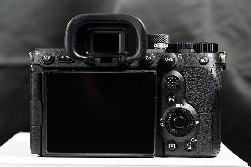 背面。ボタン・ダイヤルの数や位置はα7ivと変わらない。操作感がα7ivとほぼ一緒なので慣れるのが早いかも。背面液晶は4軸マルチアングル液晶なのでヒンジ部分がα7ivと差異がある。